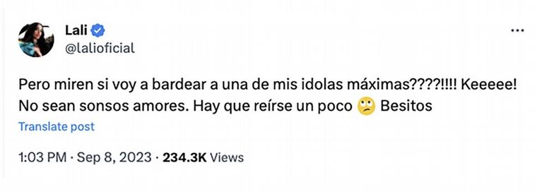 Finalmente Lali salió a dar su versión. “Pero ¡¿miren si voy a bardear a una de mis idolas máximas?! Keeeee. No sean sonsos amores. Hay que reírse un poco. Besitos”, aseguró la cantante a través de Twitter.