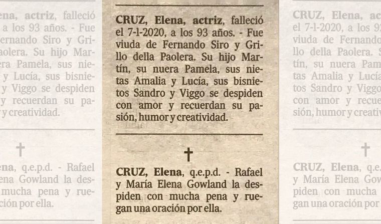Aviso fúnebre que fue publicado por el fallecimiento de Elena Cruz.