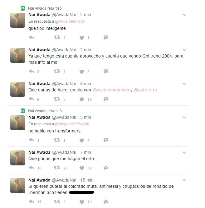 Naiara Awada fue víctima del hackeo de su cuenta de Twitter, de usuario @AwadaNai, donde se publicaron una serie de insultos, bromas y contenidos subidos de tono durante la tarde del sábado.