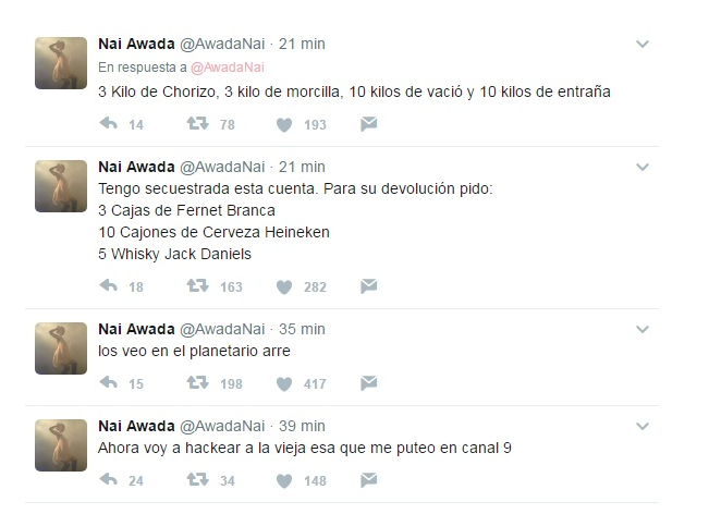 "Tengo secuestrada esta cuenta. Para su devolución pido: 3 cajas de Fernet Branca 10 cajones de cerveza Heineken 5 Whisky Jack Daniels", fue el primer mensaje que publicaron, y luego agregaron: "3 kilos de chorizo, 3 kilos de morcilla, 10 kilos de vacío y 10 kilos de entraña".