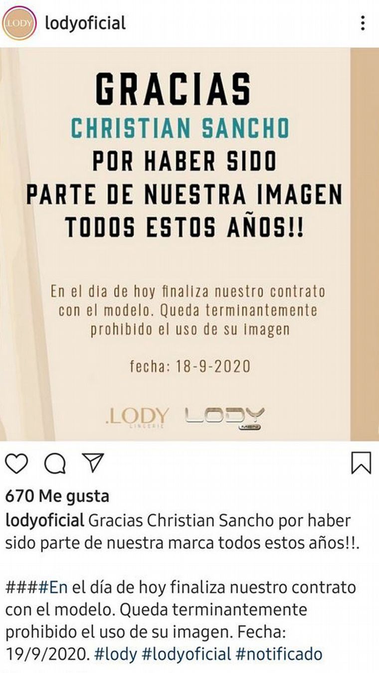 La marca de ropa interior Lody desató una polémica tras anunciar su desvinculación con Christian Sancho a través de un comunicado en su cuenta oficial de Instagram.