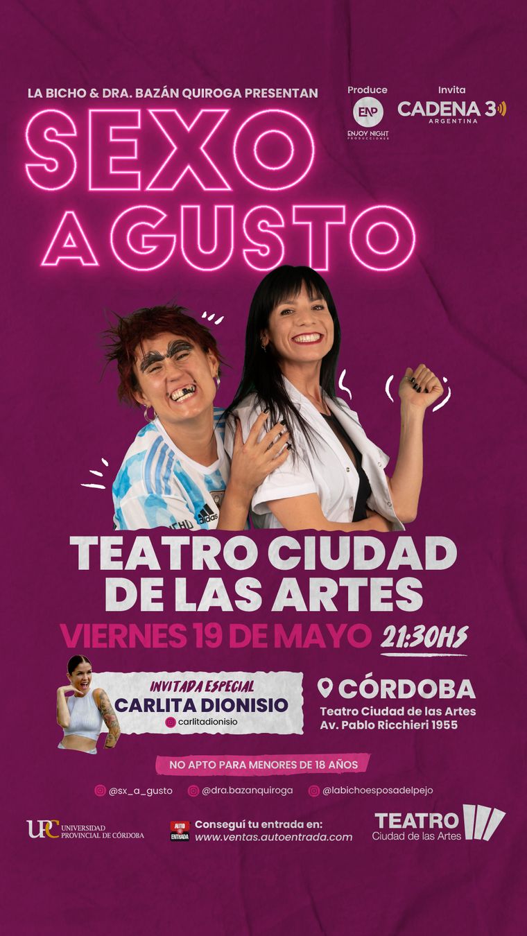 Carla Dogliani, con su popular y querido personaje "La Bicho", y la doctora Eugenia Bazán Quiroga, llegan con su show "Sexo a Gusto" al teatro Ciudad de las Artes el próximo viernes 19 de mayo a las 21.30 horas.