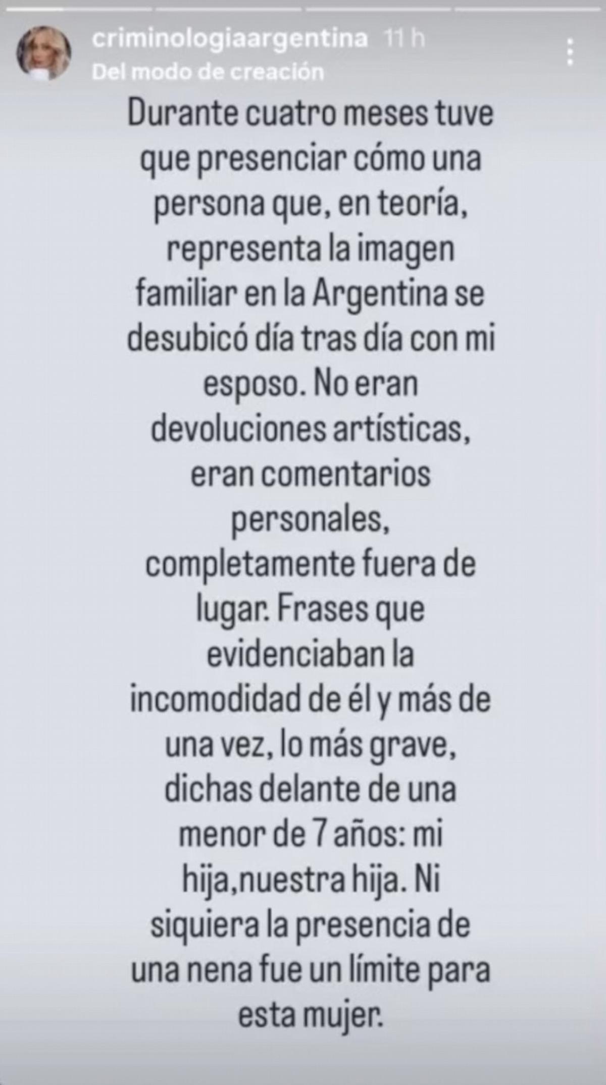 Al ser preguntada si había intercambiado mensajes con Carbone tras el posteo, Pastorutti respondió: "No hablé con ella, no tengo relación". La exvedette había realizado acusaciones en sus historias de Instagram, evitando mencionar nombres, pero su mensaje fue claro. Durante una serie de publicaciones, Carbone afirmó: "Durante cuatro meses tuve que presenciar cómo una persona que, en teoría, representa la imagen familiar en la Argentina se desubicó día tras día con mi esposo".