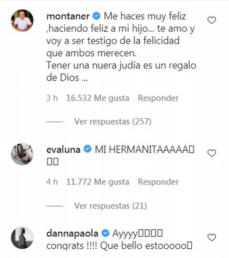Además, muchos famosos de todo el mundo dejaron su “me gusta” y conmovedores mensajes de felicitaciones y amor para la pareja. Algunos de ellos son Mica Tinelli, el Pollo Álvarez, el español Alejandro Sanz, Nai Awada, Virginia Gallardo, Barbie Vélez, Malena Narvay, Oriana Sabatini, Sebastián Yatra, Barbie Franco, Cande Ruggeri, Stephanie Demner, Lizardo Ponce, la mexicana Danna Paola y Nati Jota.