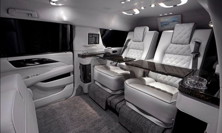 Además, las dos butacas principales tienen apoya piernas y están forradas en cuero blanco. También instaló un televisor inteligente de 43 pulgadas, pantallas LCD de 12 pulgadas para los pasajeros, dos tarjetas SIM para tener conexión a internet asegurada, sistema de sonido 7.1 y mesas plegables en madera.