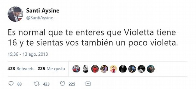 "Es normal que te enteres que Violetta tiene 16 y te sientas vos también un poco violeta", había escrito el artista en Twitter sobre Tini Stoessel, la protagonista de la serie infantil.