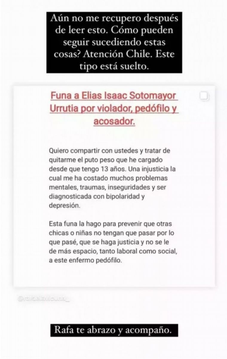Al leer este mensaje, la China Suárez, actual pareja de Benjamín Vicuña, compartió el posteo de Rafaela en una story, sumándole sus palabras de apoyo: “Aún no me recupero después de leer esto. ¿Cómo pueden seguir sucediendo estas cosas? Atención Chile, este tipo está suelto. Rafa, te abrazo y te acompaño”.