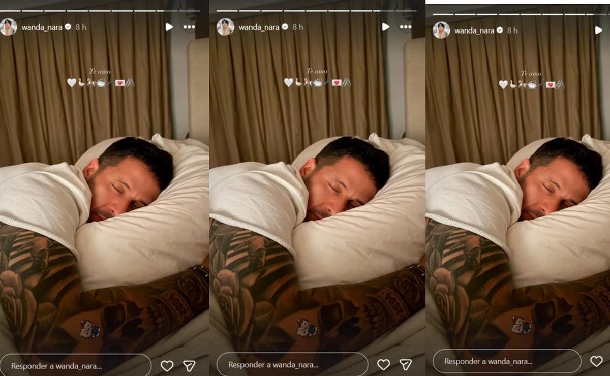 Desde la cama de su habitación en el Chateau Libertador, Wanda Nara publicó una foto de su pareja, Martín Migueles, durmiendo junto a ella.
