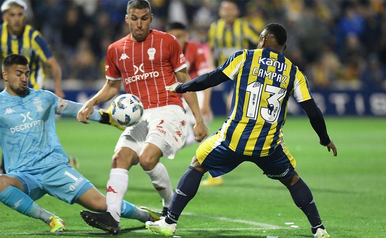 Hasta que a los 41 minutos, el delantero colombiano Campaz, que jugó en una pierna porque aparentemente se resintió de un golpe sufrido en el clásico de la fecha pasada, tiró una pared por la izquierda del área, O'Connor se le devolvió de primera y el tumaqueño la pinchó de tres dedos, con el botín zurdo, y la pelota sobró al arquero y entró junto al segundo palo.