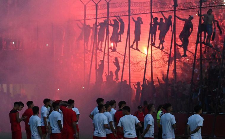 ?? El equipo de Mauricio Larriera ya pisa el campo de juego y los hinchas desatan la fiesta con fuegos artificiales y celulares. Se canta "el domingo cueste lo que cueste".