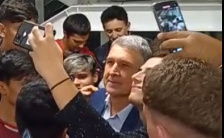 Los estudiantes del Isef N°11, cuyo edificio fue inaugurado en la zona este lunes, se amontonaron cuando descubrieron la presencia del ídolo "rojinegro", quien asistió al acto oficial.
