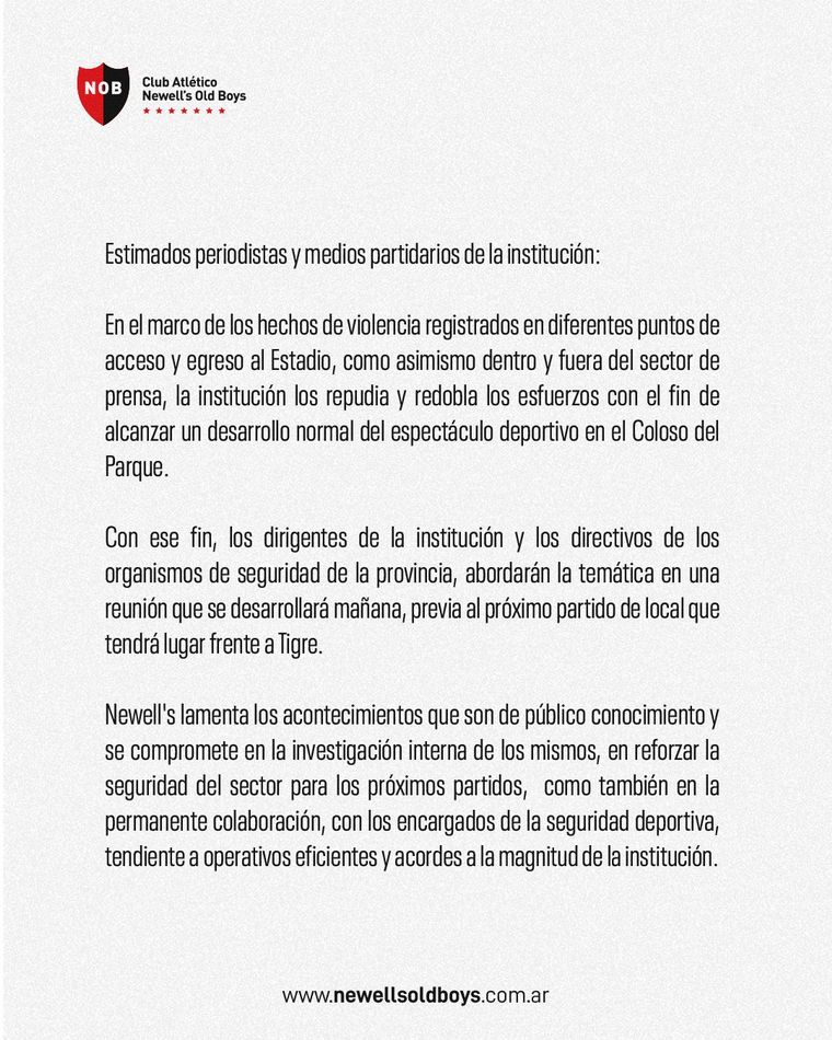 Asimismo, se anunció que este martes se llevará a cabo una reunión entre los dirigentes del club y las autoridades de seguridad de la provincia para abordar la problemática surgida durante el partido. Esta reunión se realizará previamente al próximo encuentro como local, que enfrentará a Newell's contra Tigre.