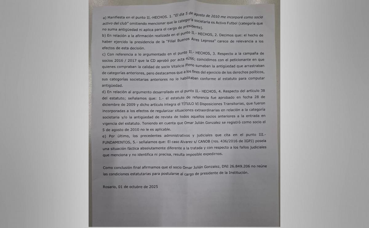 La resolución también recordó que este mismo planteo se había realizado en 2021, cuando González tampoco fue habilitado por razones similares, y que entonces fue informado y consentido sobre su situación respecto a la antigüedad como socio pleno. Según la Junta, los precedentes administrativos y judiciales citados por el postulante no resultan aplicables al caso.