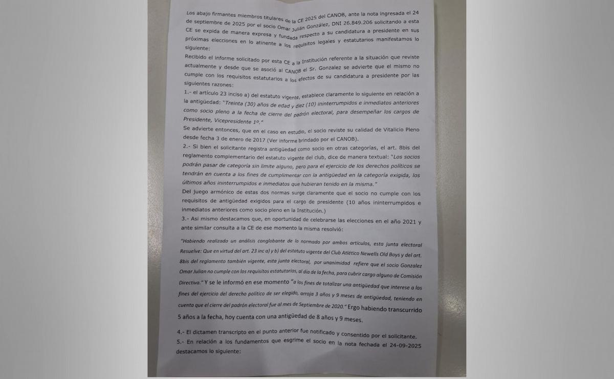 La Junta Electoral no habilitó al referente de Autoconvocados NOB, Julián González, para competir por la presidencia del club por contar "solo con 8 años y 9 meses, por debajo del mínimo exigido".