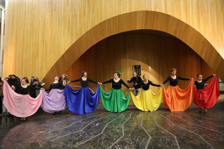 El acto inaugural contó con la performance de danza y música “Diversidad en Vuelo”, interpretado por bailarinas del Equipo Desafiarte, quienes, con el giro de coloridas polleras, “pintan paisajes que invitan al imaginario inclusivo y la convivencia diversa de humanidad en vuelo”.