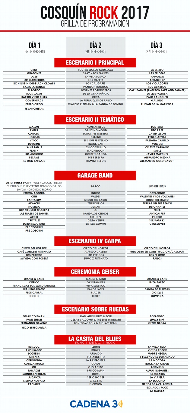 Ya está la grilla del Cosquín Rock 2017. El festival más federal del país se desarrollará el 25, 26 y 27 de febrero en el aeroclub de la localidad cordobesa de Santa María de Punilla.
