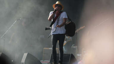 Guasones, uno de los principales atractivos del primer día del Cosquín Rock, llegó al predio del festival luego de un extenso viaje en colectivo, con solo minutos de margen; y aún sin hacer la prueba de sonido ofrecieron un show increíble en el Aeródromo de Santa María de Punilla.