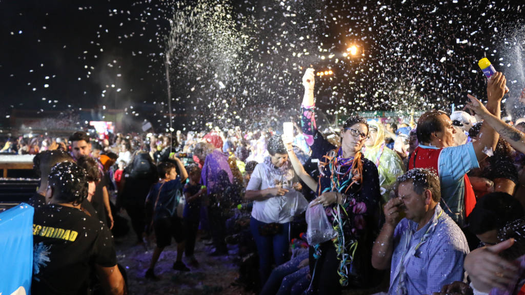 En el espacio "Postales de provincia", la delegación de Jujuy colmó el escenario con un centenar de bailarines de atuendos variopintos, mientras en toda la plaza Próspero Molina la gente tiraba espuma loca, harina y papeles picados.