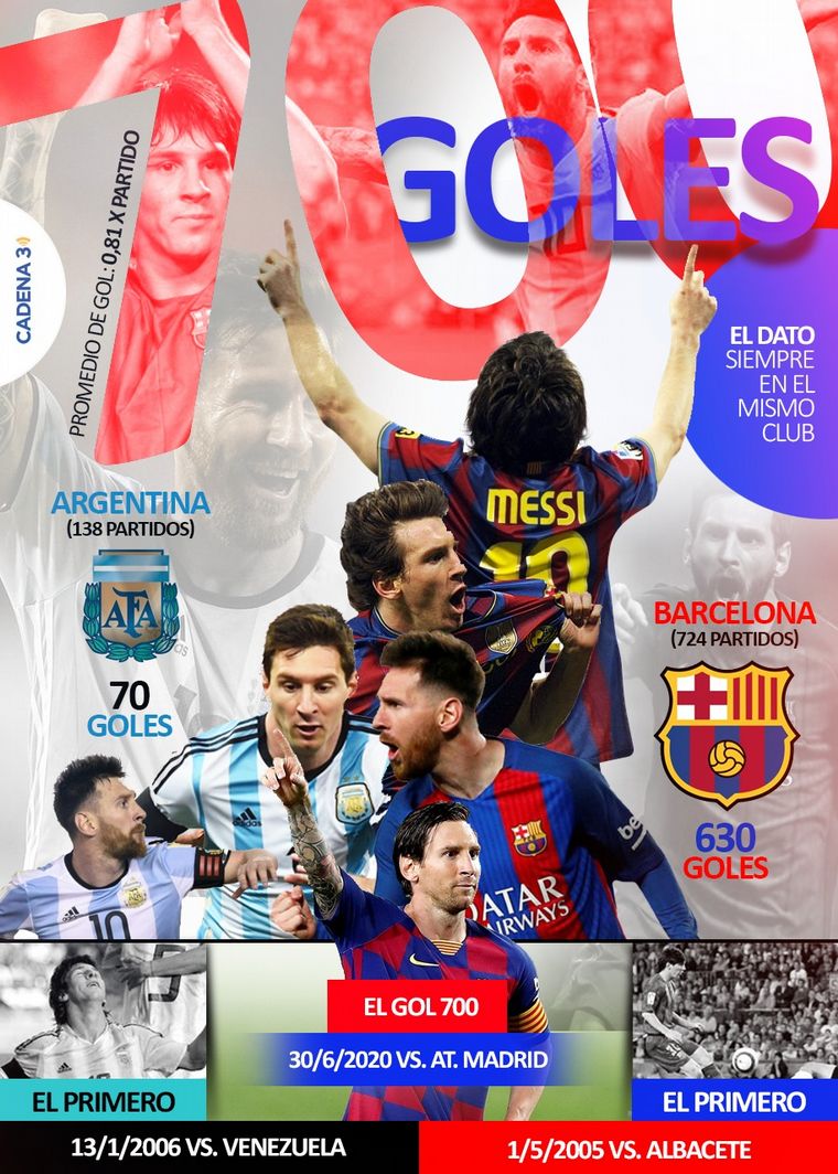 El astro rosarino alcanzó la cifra con un exquisito penal ante Atlético de Madrid. Es el único argentino en lograrlo. Marcó 630 tantos con Barcelona y 70 con la Selección y es el máximo goleador histórico de ambos.