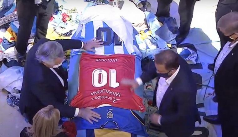 Allí, acompañado por el presidente de Argentinos Juniors, Cristian Malaspina, y el actual entrenador del primer equipo masculino del "Bicho" Diego Dabove, también colocaron una camiseta del club de La Paternal con el número 10 y el apellido Maradona sobre el féretro, donde ya estaban la de su despedida como futbolista con los colores de Boca y la del campeón del mundo de 1986 con la Selección argentina.
