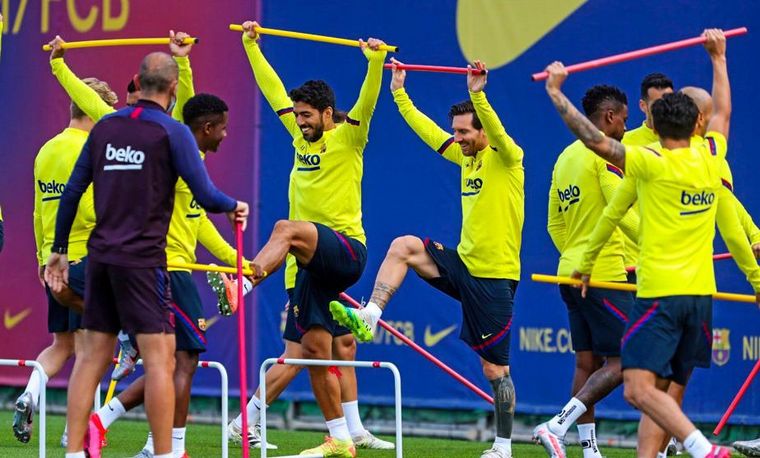 Durante la sesión de este lunes, Messi se dejó ver sonriente trabajando junto a sus compañeros tanto en el calentamiento como en los rondos posteriores, según las imágenes que difundió el club.