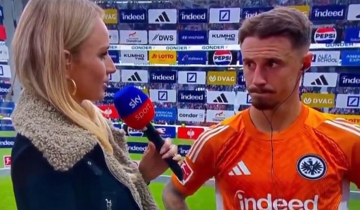 El jugador, quien para sorpresa de la reportera llevaba puesta la camiseta del arquero rival, Michael Zetterer, reaccionó con visible incredulidad y se lamentó moviendo la cabeza.