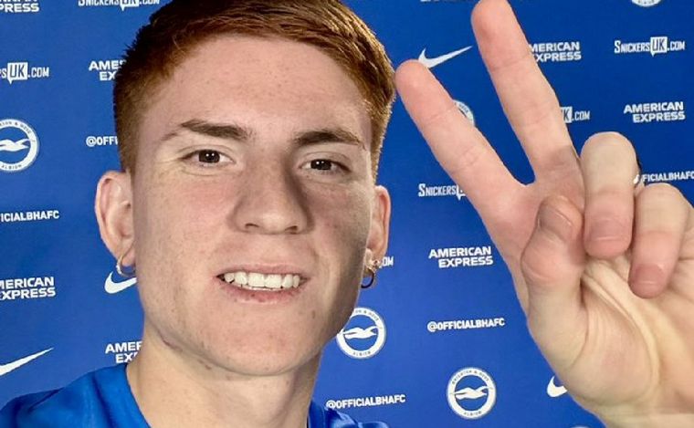 "Miren quién está aquí", posteó la cuenta de X de Brighton con una foto del futbolista argentino luciendo su nueva casaca con una sonrisa y los dedos en "V".