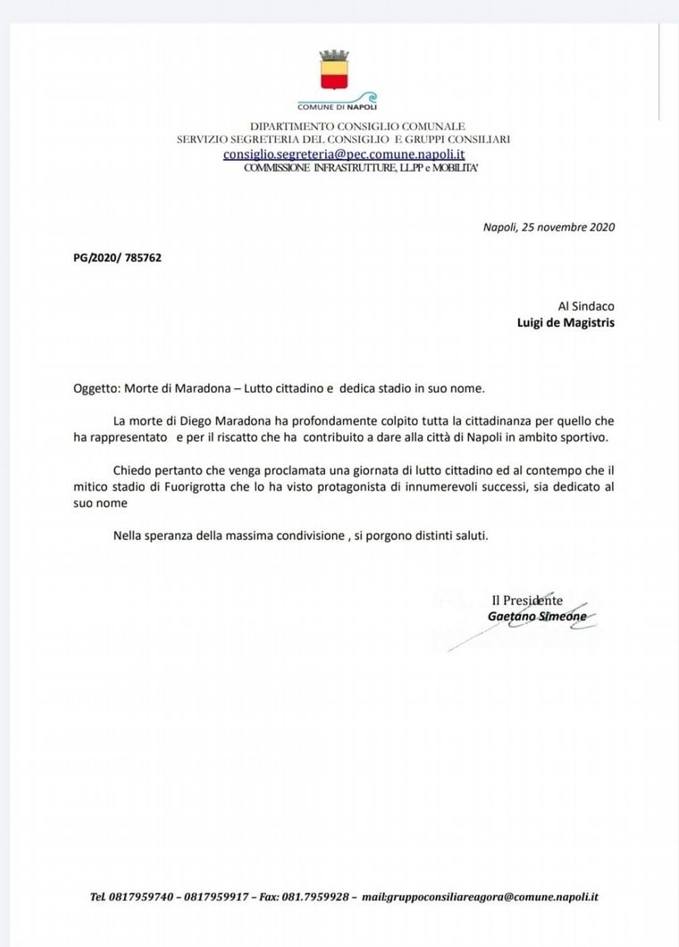 El propio alcalde de Nápoles, Luigi de Magistris, anunció a través de su cuenta de Twitter: "¡¡¡Nombramos el Estadio San Paolo en honor al mejor jugador de todos los tiempos!!!".