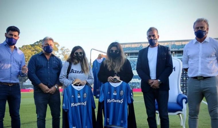 Los dirigentes le dieron a las hijas del "Diez" las camisetas que se prepararon de manera especial para celebrar los 59 años del astro, y también el primer buzo que usó en su presentación como entrenador de Gimnasia.