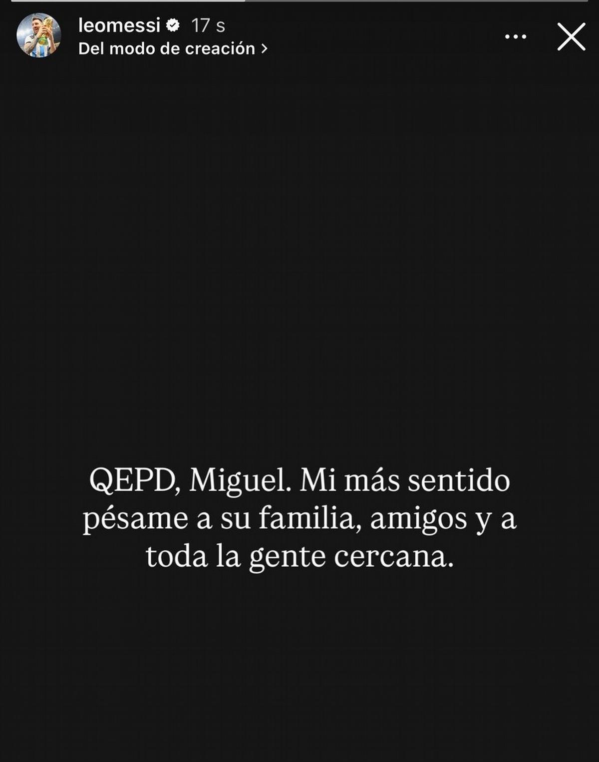 "QEPD, Miguel. Mi más sentido pésame a su familia, amigos y a toda la gente cercana", escribió el astro argentino en una historia de su cuenta personal de Instagram.