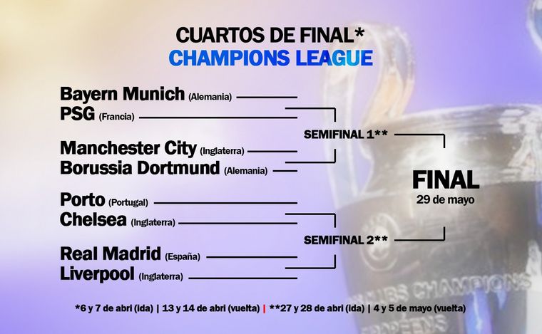 En tanto, también se dieron a conocer los cruces en las semifinales del campeonato de Europa y en una de ellas el ganador del partido entre Bayern Múnich y el PSG abrirá la serie como local ante el vencedor del encuentro entre el Manchester City y el Borussia Dortmund, que definirá como local.