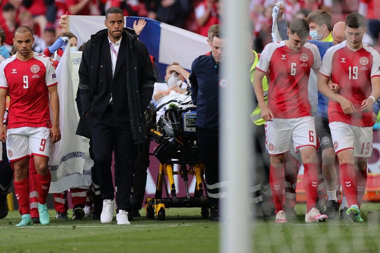 Después de la atención, el futbolista fue trasladado al hospital principal de Copenhague y al salir de la cancha en camilla una foto pudo captarlo ya en estado consciente, con su mano izquierda sobre la frente.