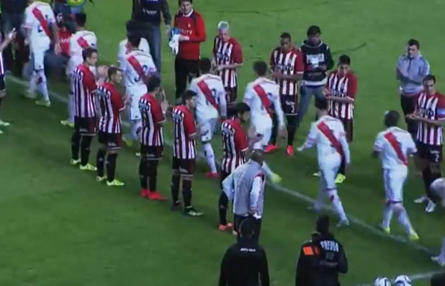 Los jugadores del “Pincha” formaron dos filas para que sus pares del “Millonario” pasaran por el medio. Con aplausos, reconocieron al campeón de la Libertadores.