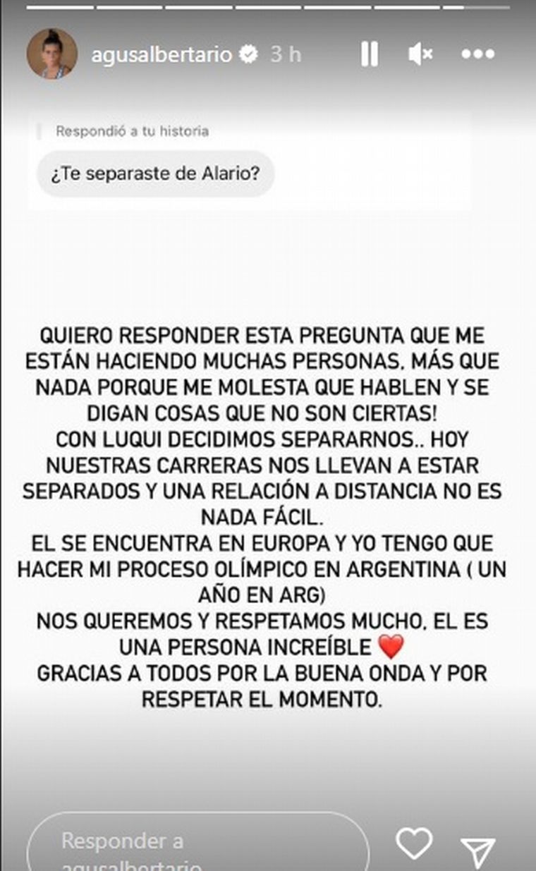 La jugadora de la selección argentina de hockey Agustina Albertario confirmó su separación del futbolista Lucas Alario mediante un comunicado en sus redes sociales y reveló cuál fue el motivo: "No es nada fácil".