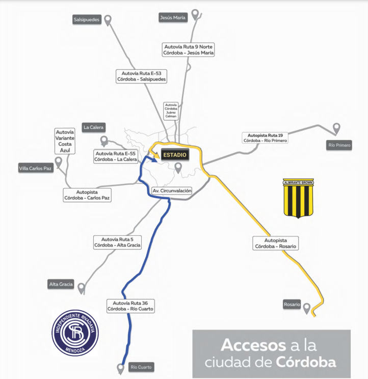 La delegación del Club Almirante Brown estará alojada en el hotel Howard Johnson y el plantel entrenará en el predio de Instituto, mientras que la de Independiente Rivadavia lo hará en el hotel Quinto Centenario y el equipo trabajará en el Centro de Alto Rendimiento de Talleres.