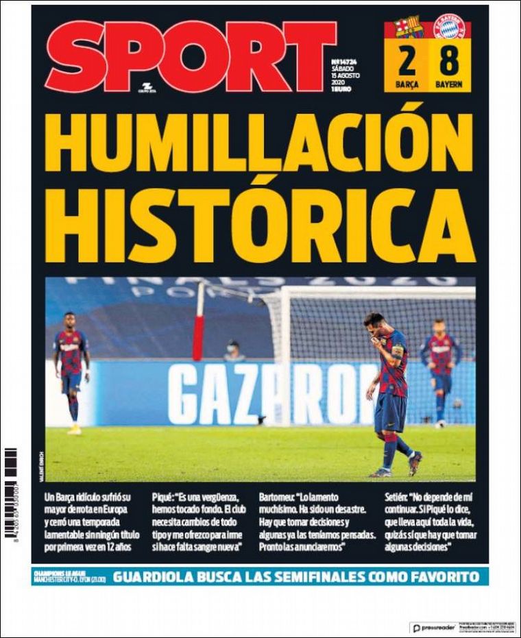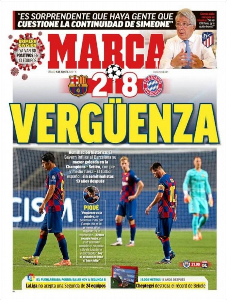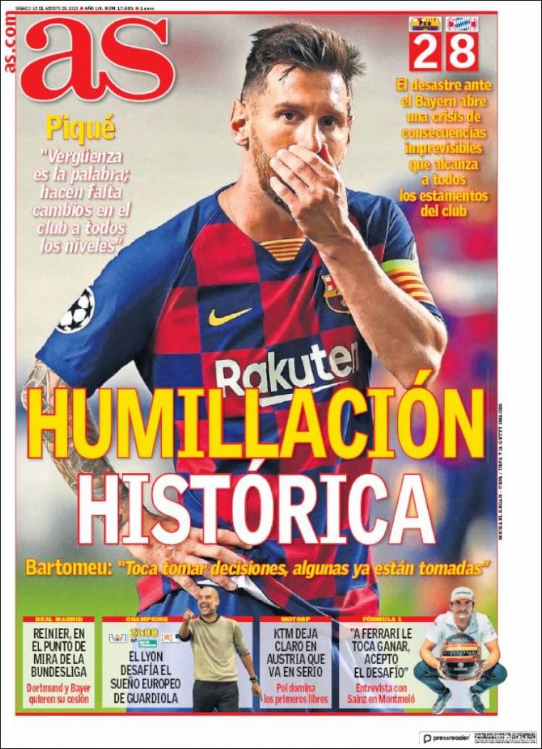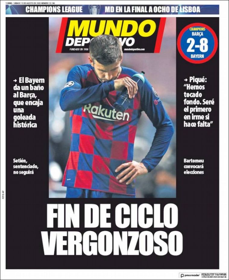 El diario recogió también las primeras reacciones de los jugadores, entre ellos las de Gerard Piqué: "Vergüenza es la palabra. No se puede competir así, no es la primera ni la segunda ni la tercera vez. Espero que sirva de algo. Es muy duro. A reflexionar todos. El club necesita cambios y no hablo ni del entrenador ni de los jugadores, no quiero señalar a nadie".