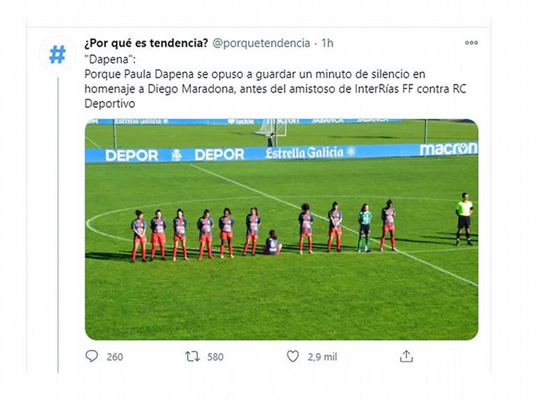 Dapena criticó al “10” por su trato hacia las mujeres. En la previa del partido en el que su equipo cayó 10 a 0 ante el Deportivo La Coruña en Abegondo, anunció que iba a realizar un gesto para plasmar su desacuerdo con ese minuto de silencio.