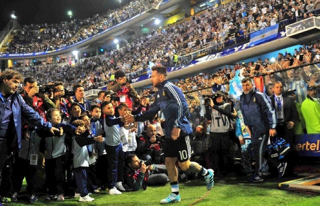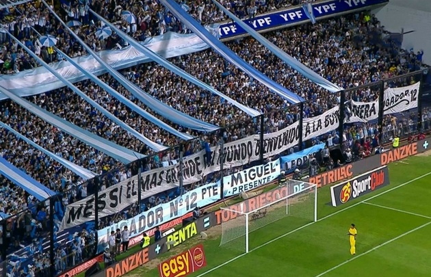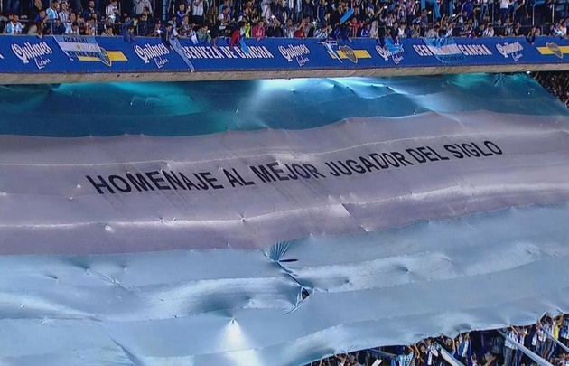 Fue cuando ingresaron los equipos a la cancha. Los hinchas desplegaron grandes banderas con elogios para el crack. El capitán argentino agradeció el recibimiento. Mirá el video