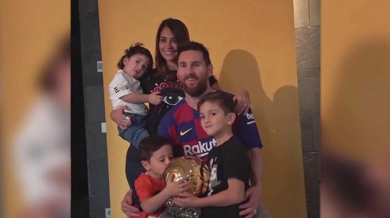 A su regreso a Barcelona, la familia posó con el "balón de oro" que el astro recibió en París y su hijo del medio, dio nuevamente de qué hablar por un gesto que imita a otra leyenda del fútbol.