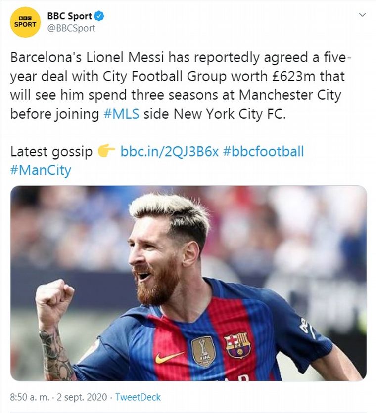 "Messi llegó a un acuerdo de cinco años con el City Football Group por valor de 623 millones de libras (unos 700 millones de euros) para pasar tres temporadas en el Manchester City antes de unirse al New York City FC de la MLS", publicó la BBC en su cuenta de Twitter.