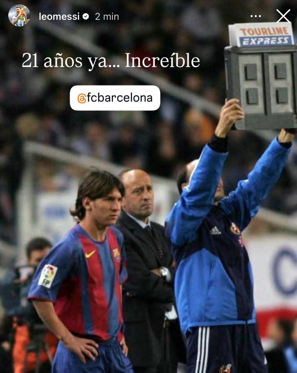Messi escribió "21 años ya… Increíble" en redes sociales al recordar su debut con el Barcelona.