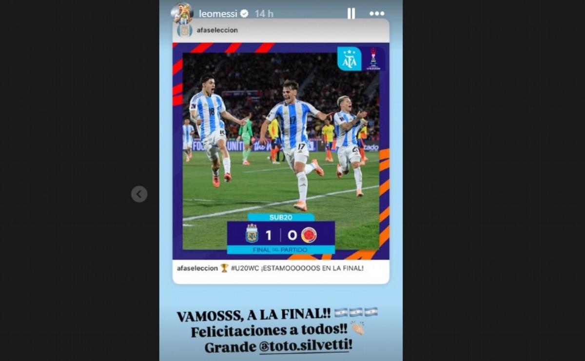 El "10" de la Selección mayor compartió una historia en su Instagram personal felicitando a la Selección Sub 20, que se clasificó a la final del Mundial.