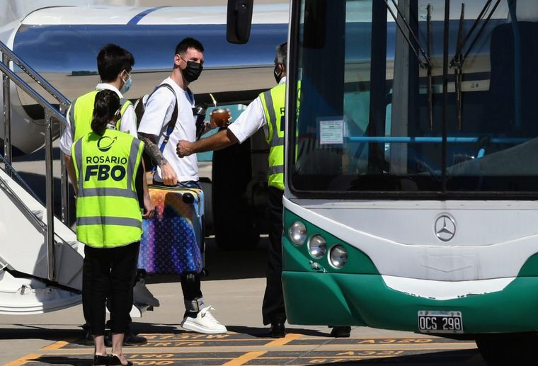 Messi descendió del avión por una de sus escalinata con una mochila en su espalda, una pequeña valija en su mano derecha, un mate sujeto con por la otra y un termo bajo con la axila del brazo izquierdo, según fue retratado por la cuenta especializada Saar Ari Ros en Twitter.