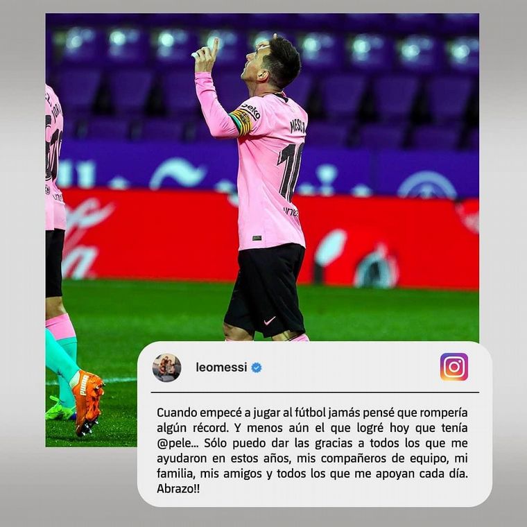 "Cuando empecé a jugar al fútbol jamás pensé que rompería algún récord. Y menos aún el que logré hoy -por este martes- que tenía Pelé...Sólo puedo dar las gracias a todos los que me ayudaron en estos años, mis compañeros de equipo, mi familia, mis amigos y todos los que me apoyan cada día. Abrazo!!", expresó "la Pulga" en su cuenta de la red social Instagram.