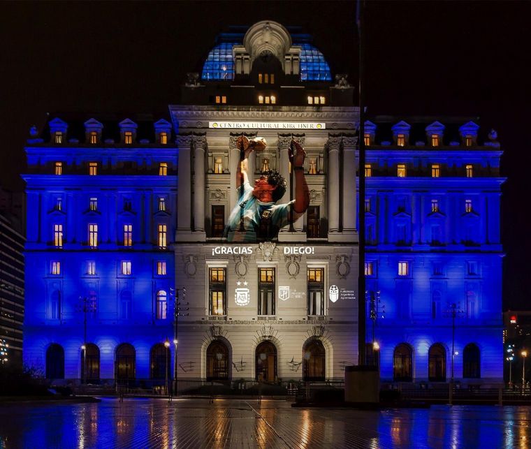El Centro Cultural Kirchner, la Pirámide de Mayo y el Obelisco proyectaron la imagen del ex astro del fútbol y los colores de la Selección argentina.