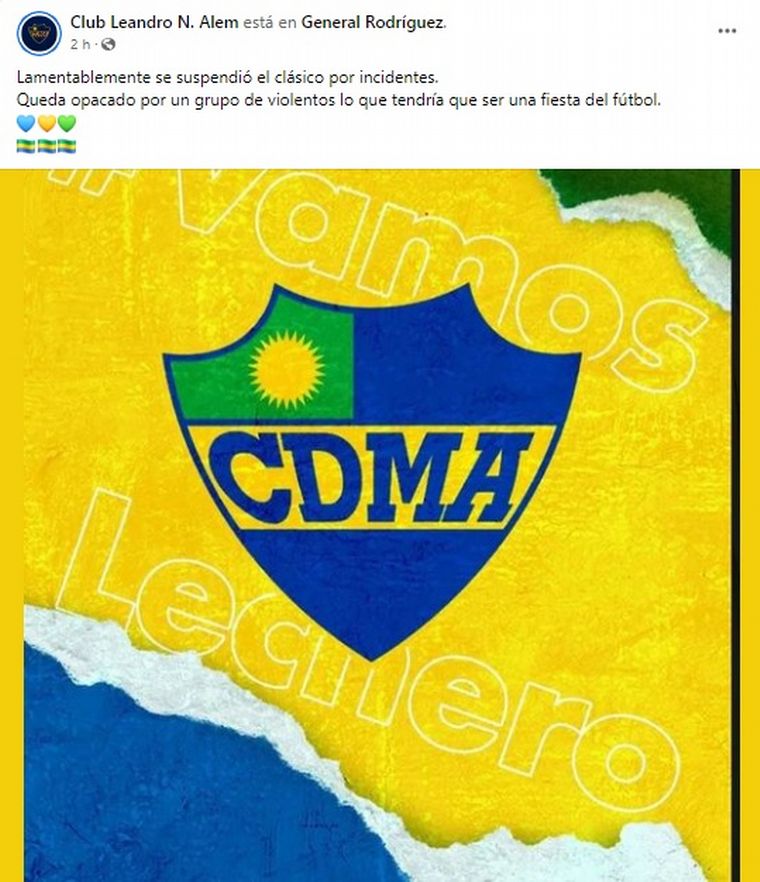 "Lamentablemente se suspendió el clásico por incidentes. Queda opacado por un grupo de violentos lo que tendría que ser una fiesta del fútbol", publicó la cuenta oficial de Alem en la red social Facebook.