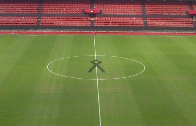 El centro del campo de juego de la cancha de Colón de Santa Fe presenta un lazo negro, en homenaje al recientemente fallecido Diego Barisone, que jugó toda su vida en Unión, clásico rival del "Sabalero".