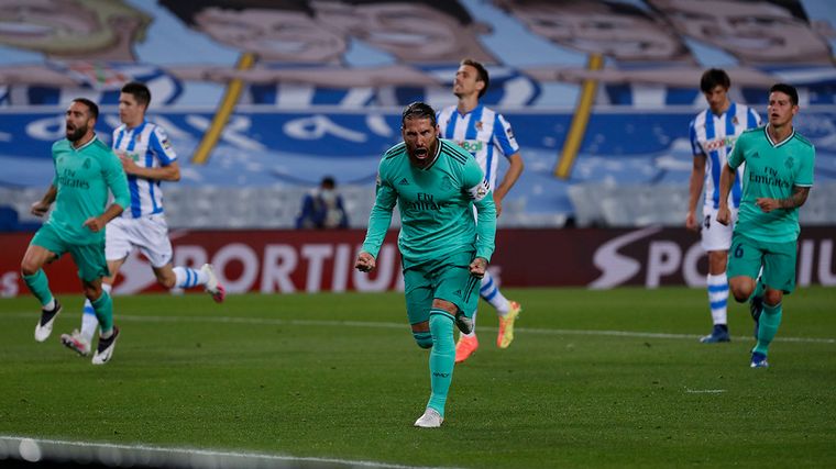 Venció de visitante a Real Sociedad por 2-1. Ramos, de penal, y Benzema anotaron los goles del “Merengue”. El equipo de Zidane tiene los mismos puntos que el de Messi, pero lo aventaja por el triunfo en el Superclásico.