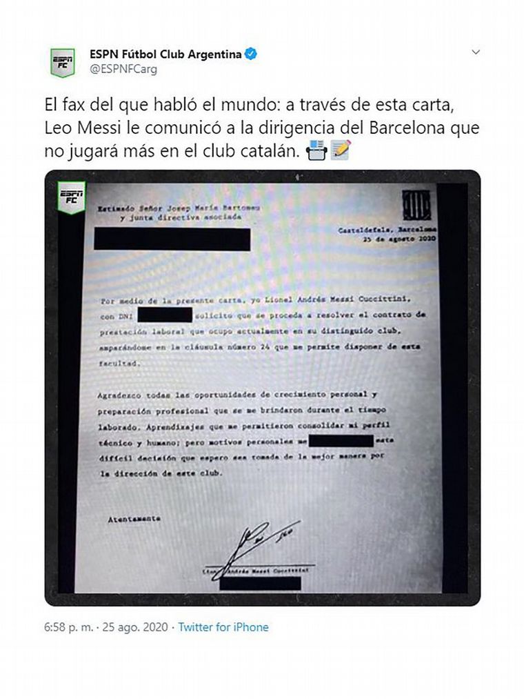 A través de redes sociales, rápidamente se movió el escrito que envió al presidente Josep María Bartomeu y el resto de la junta directiva asociada del conjunto catalán mostró las formas en las que Messi, que firmó la nota al pie, se dirigió para pedir su salida del club.