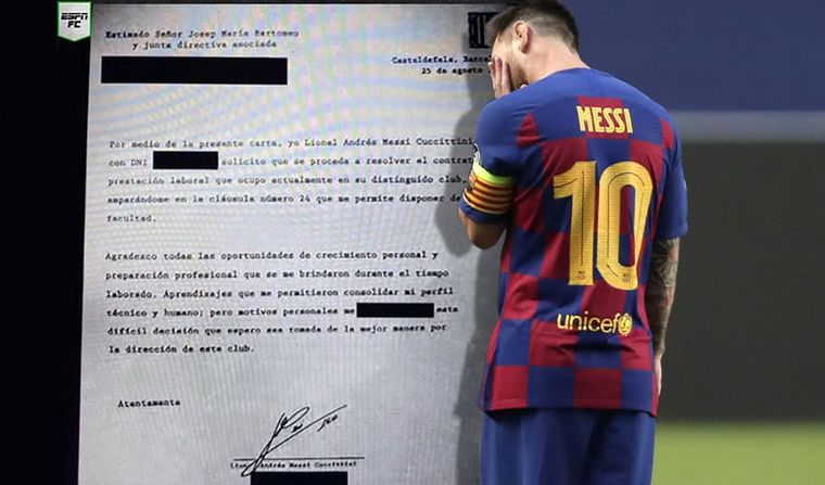 "Por medio de la presente carta, yo Lionel Andrés Messi Cuccittini, solicita que se proceda a resolver el contrato de prestación laboral que ocupo actualmente en su distinguido club, amparándose en la cláusula número 24 que me permite disponer de esta facultad", afirmó el escrito, que trascendió en redes sociales.